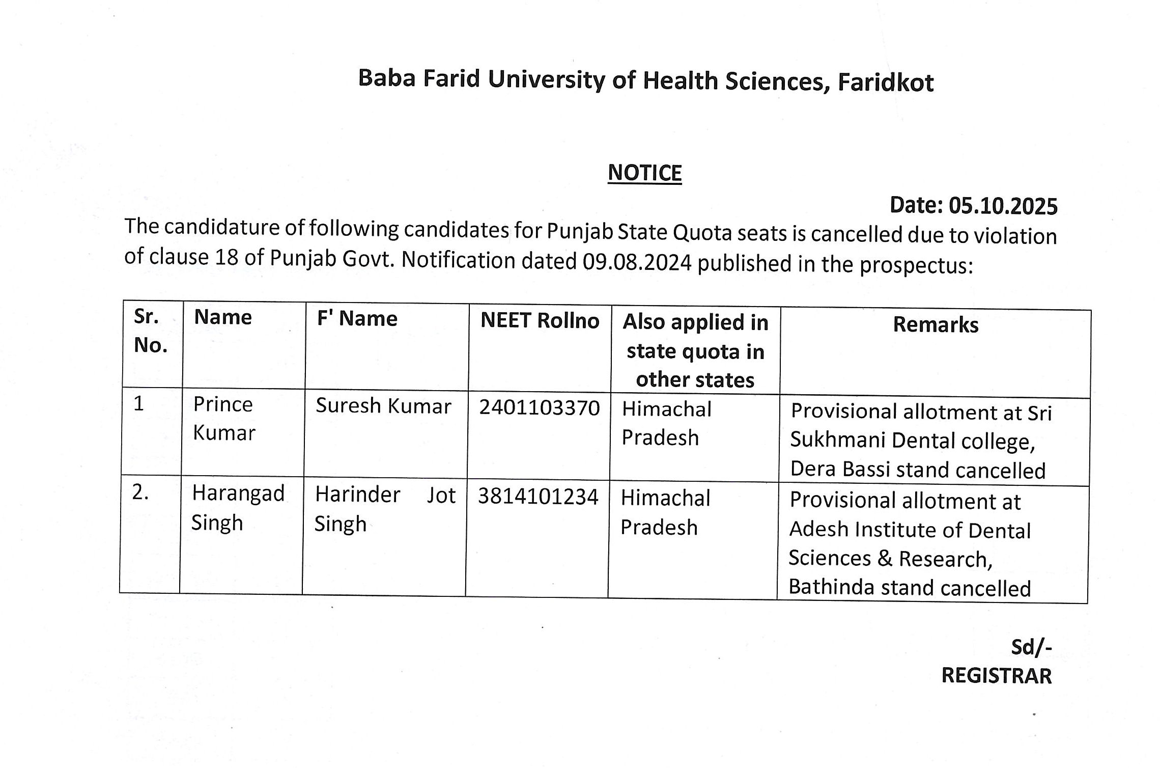 Lists of candidates applied under Christian Minority for admission to MBBS/BDS Course under NEET UG-2025 at Christian Medical/Dental College, Ludhiana