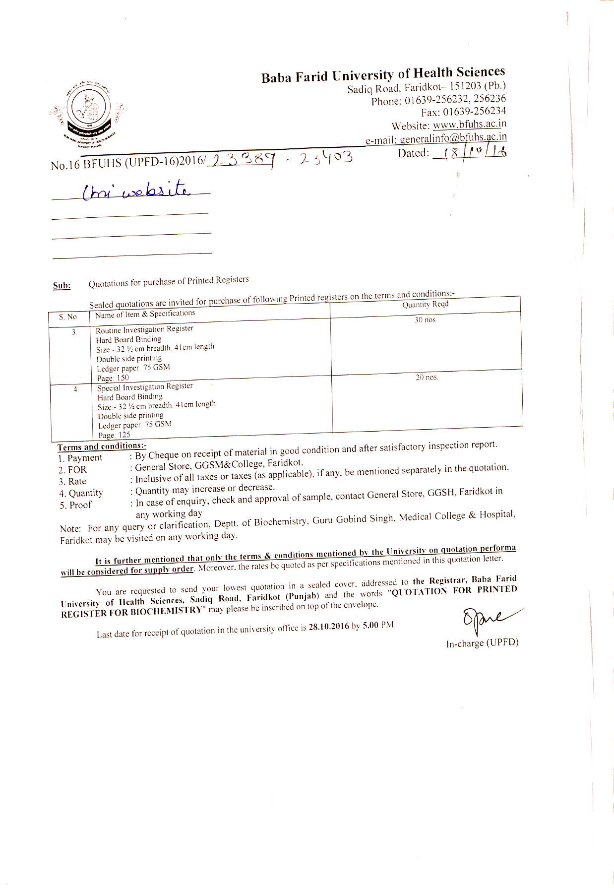 Detailed Tender instruction document including terms & conditions are available on the University/College Website www.bfuhs.ac.in and www.ggsmch.org which can be downloaded. Tenders should reach in the office of the Principal as per the time schedule mentioned in each tender.